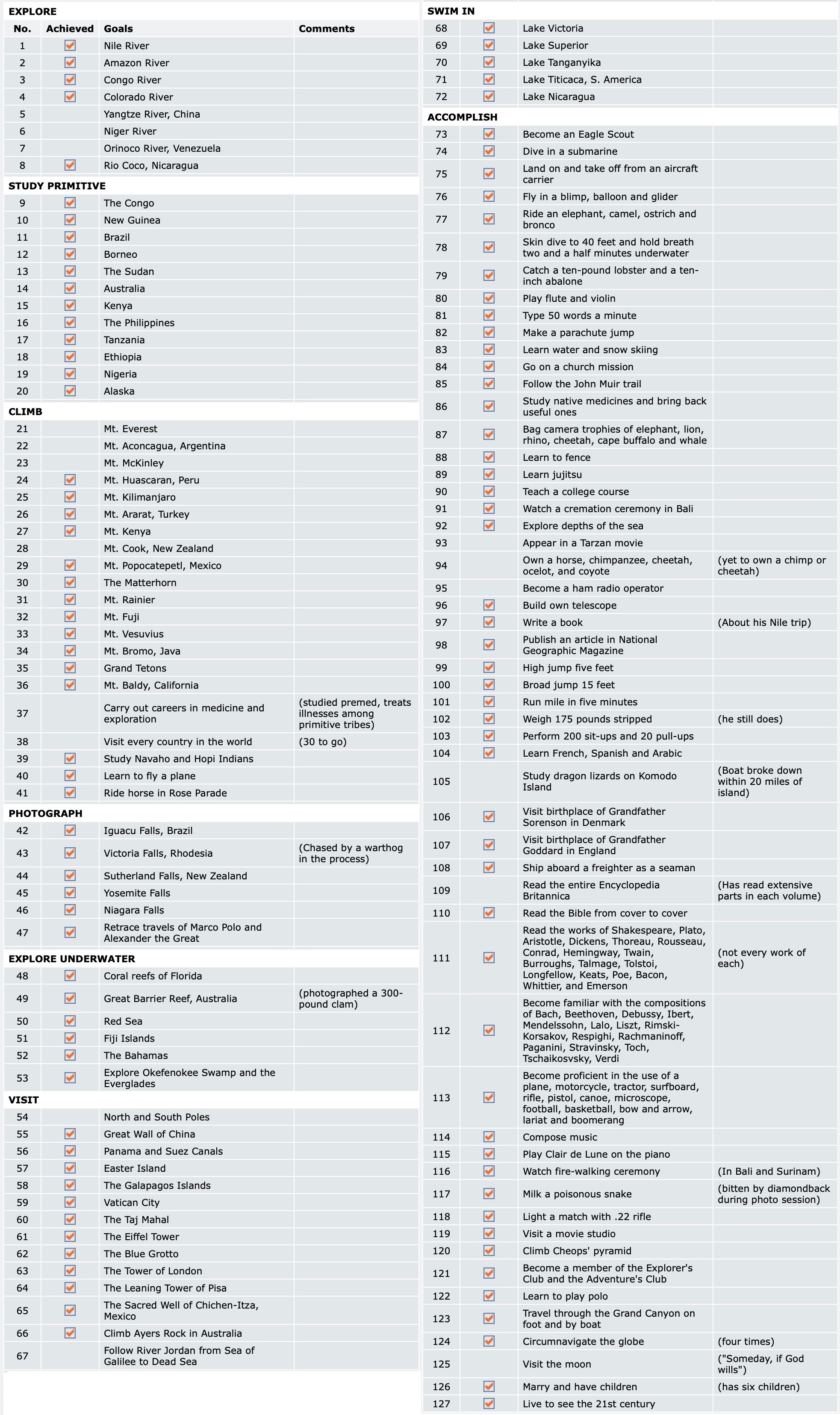 These were not simple or easy goals. They included climbing the world's major mountains, exploring from source to mouth the longest rivers of the world, piloting the world's fastest aircraft, running a mile in five minutes and reading the entire Encyclopedia Britannica.